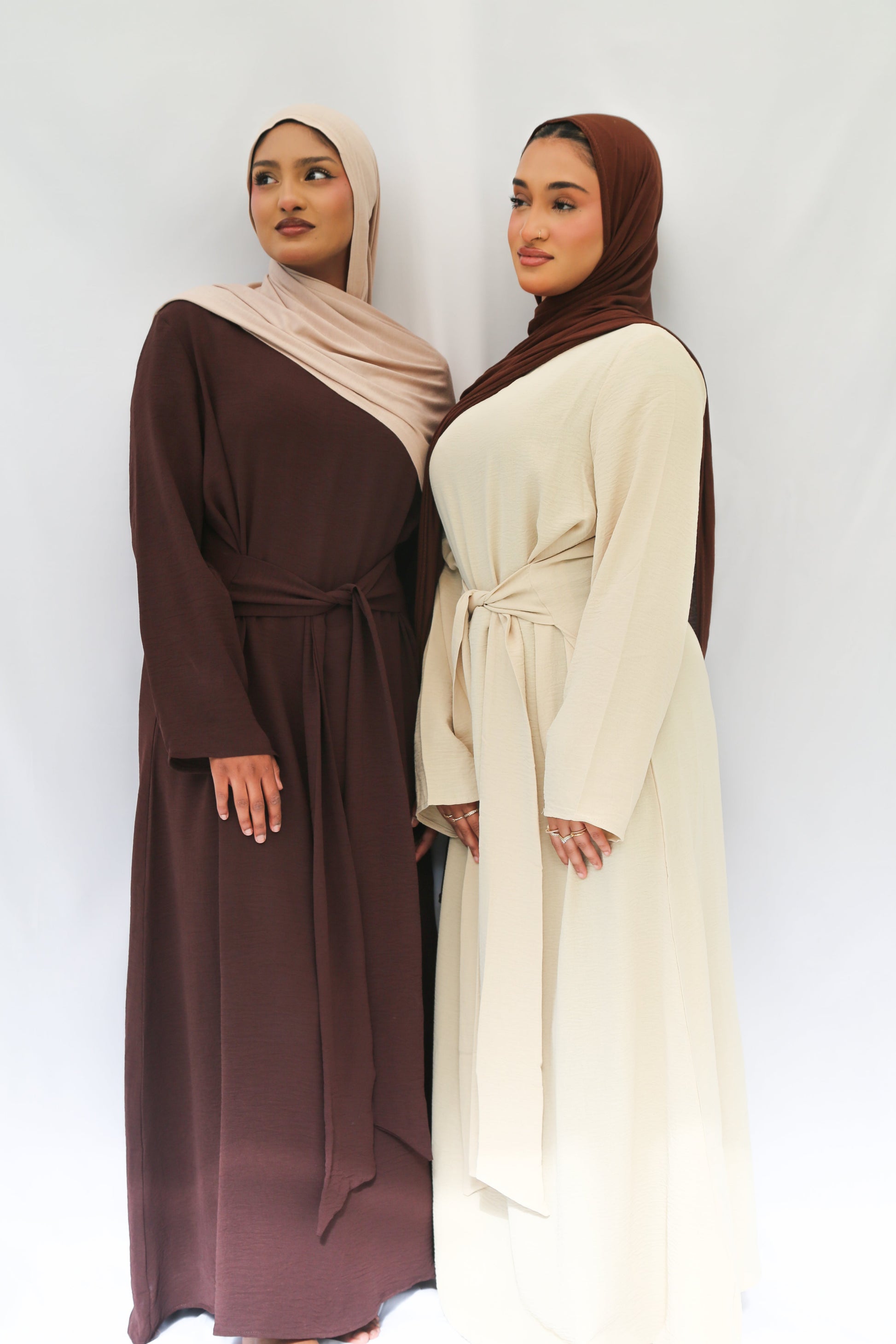 The Front-Tie Abaya Dress combines a round neckline with a thick, adjustable belt that can be worn at the front or back to discreetly conceal the tummy. Available in black, grey, brown, and cream, this versatile piece offers both elegance and comfort, allowing you to choose the perfect shade to suit your style.