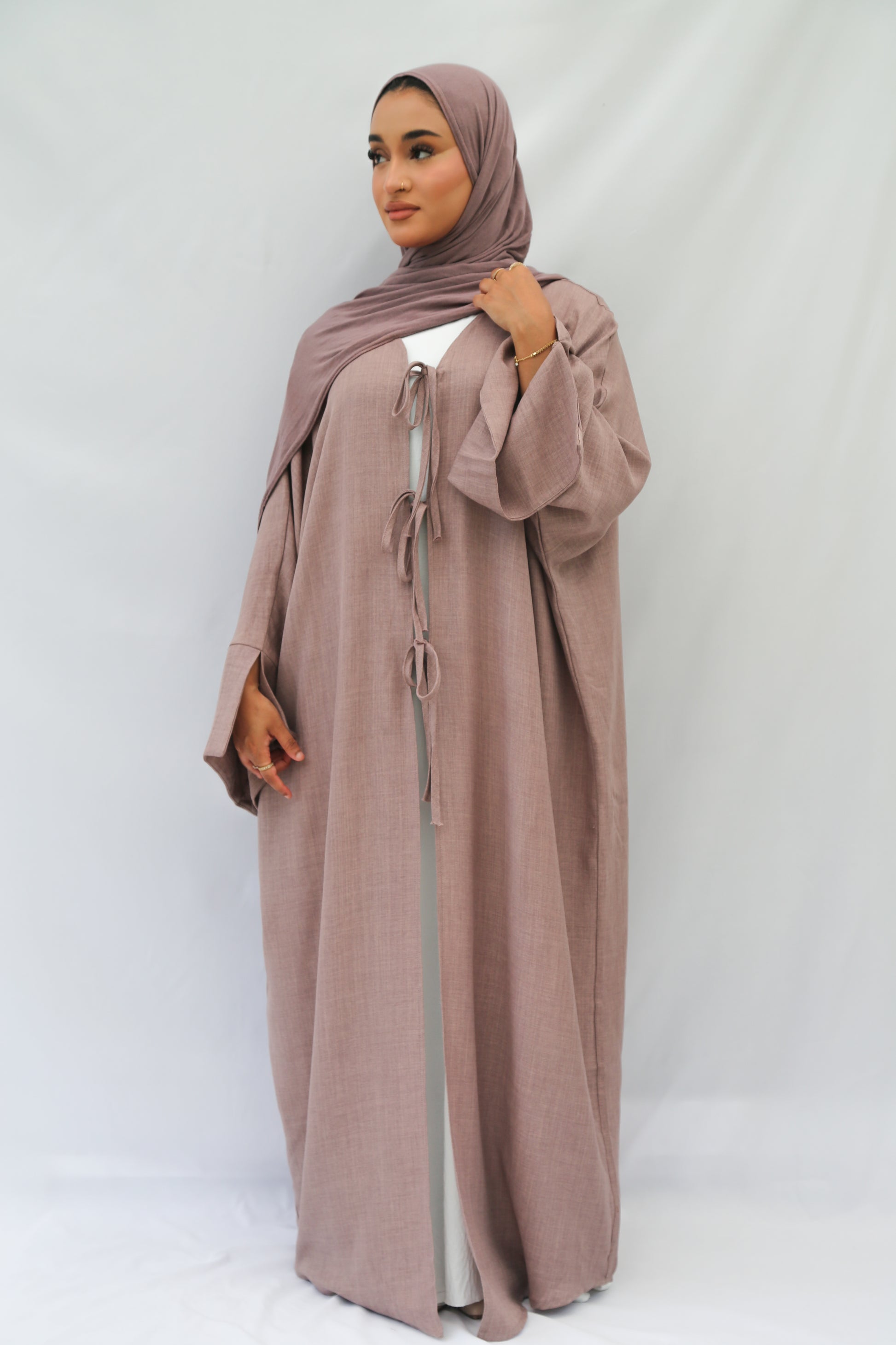 This lightweight Summer Overcoat features a neutral truffle mocha shade, perfect for pairing with any outfit. Crafted from linen-look fabric, its oversized fit and wide open sleeves add effortless elegance. Three front tie details create a charming touch, making it a versatile and stylish layer for warm days.